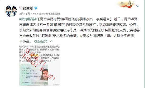 3月14日下午,湖北省洪湖市公安局官方微博@平安洪湖 发布微博辟谣称,网传洪湖村民“韩国胜”被打要求改名一事系谣言。经查,该贴文所附的身份信息真实姓名为李某,洪湖市无姓名为"韩国胜"的人员,洪湖警方也未收到过"韩国胜"要求改名的申请。此贴文纯属谣言,请广大群众不信谣、不传谣。