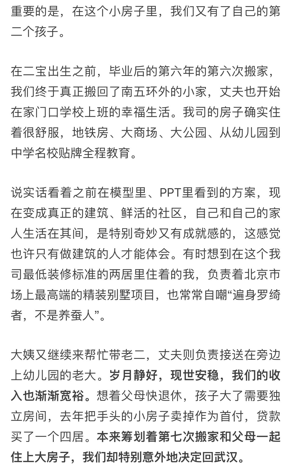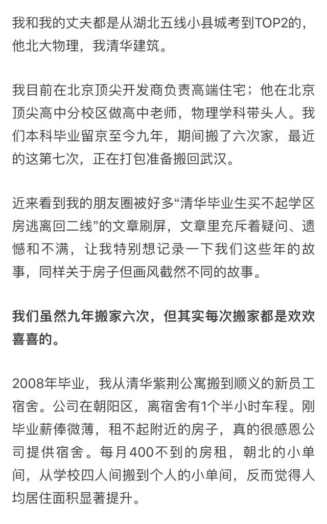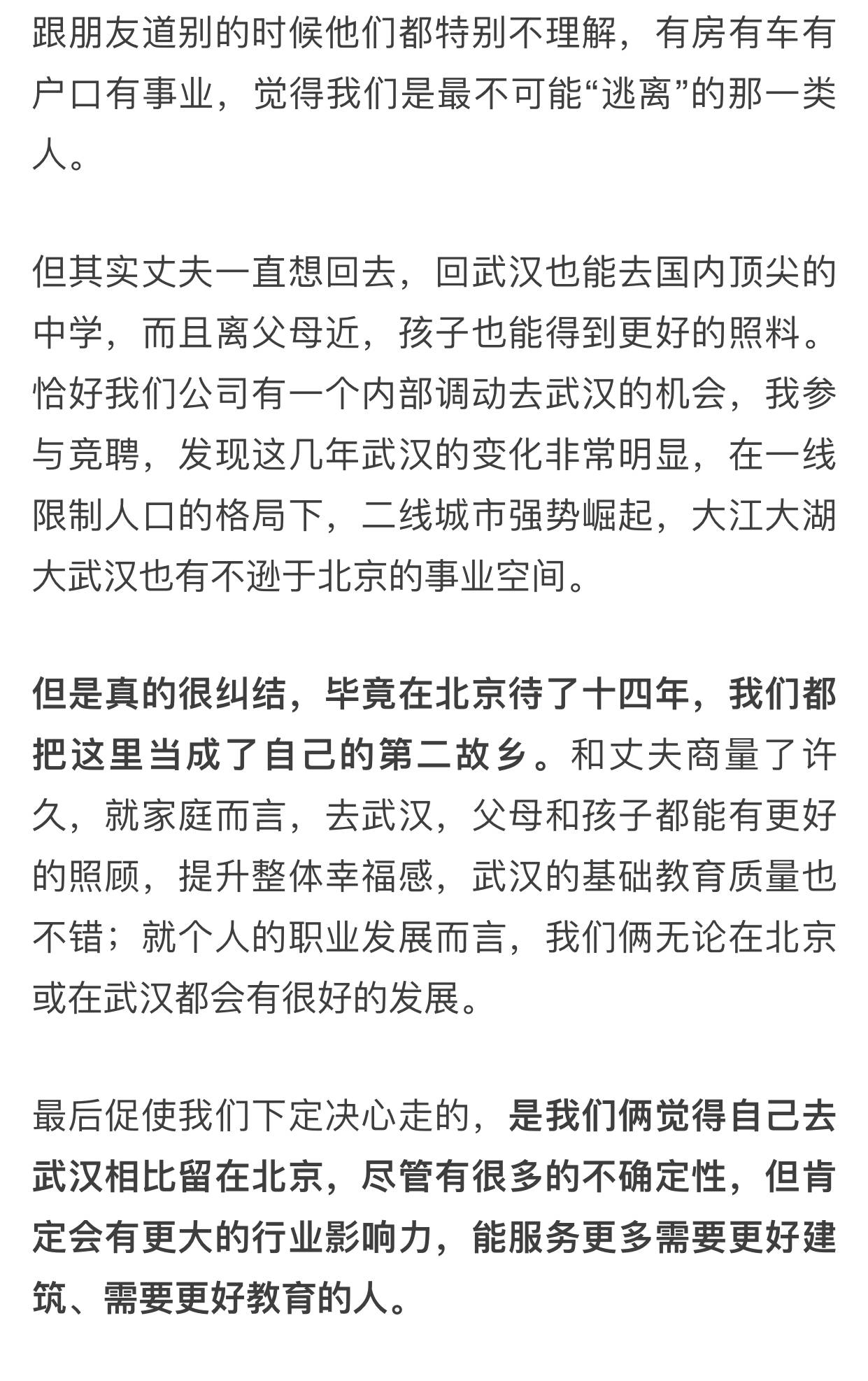 昨天,一篇来自自媒体账号“小万工”的文章在朋友圈刷屏。作者自称名校毕业,在北京学习生活14年,有房有车有户口有事业,但还是选择回武汉生活。是什么让他们做出如此选择?