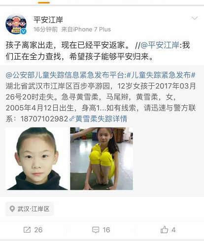 最新消息 | 武汉13岁夜跑失踪女孩已平安回到家中