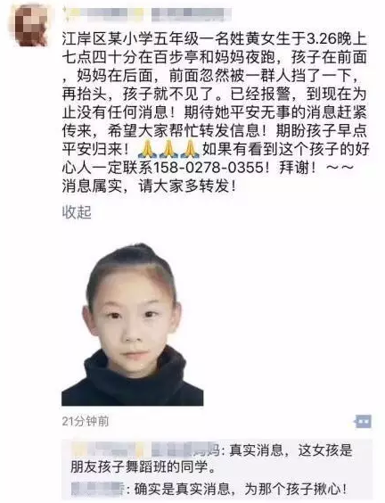 寻人启事中写到,江岸区某小学五年级一名学生,于3月26日晚上7点40分在百步亭和妈妈夜跑时丢失!