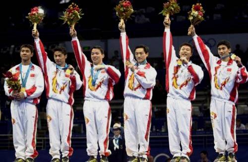 △2000年悉尼奥运会上,中国男团赢得奥运会体操团体冠军,杨威(右三)郑李辉(右一)