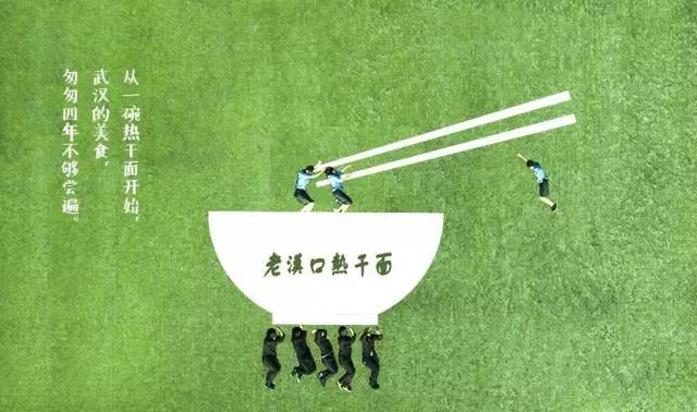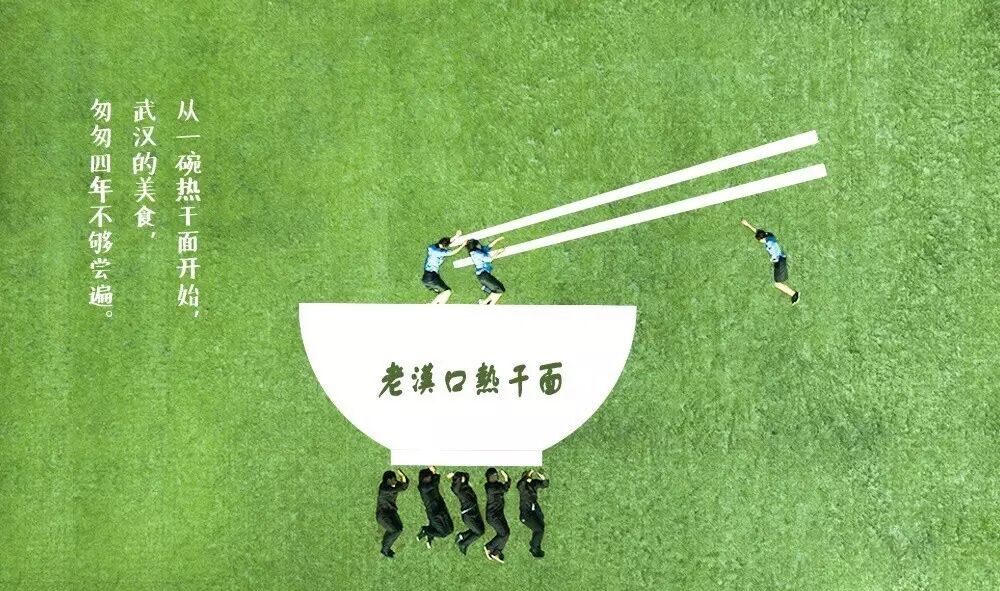 对于武汉的城市记忆,热干面是最不可或缺的一部分。学子们将面碗搬入照片之中,男生们头顶面碗,女孩们干脆跑到碗中,化身“面条”,极尽搞怪之能。