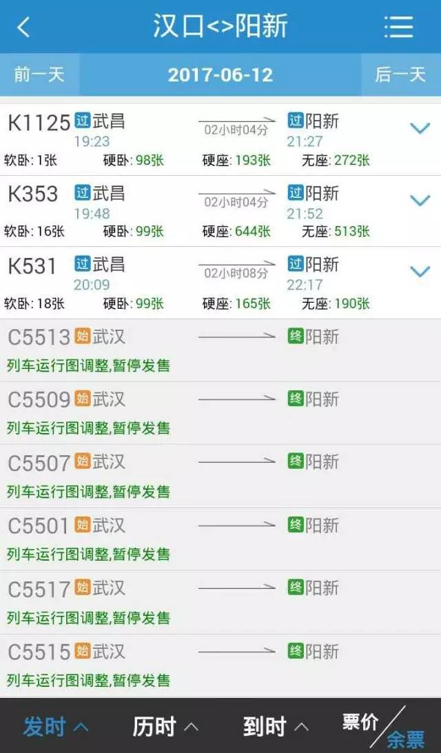 C5519次(临客),武汉19:07始发,19:19到花山南,19:35到鄂州,19:49到黄石北,20:04到白沙铺,20:15终到阳新。
