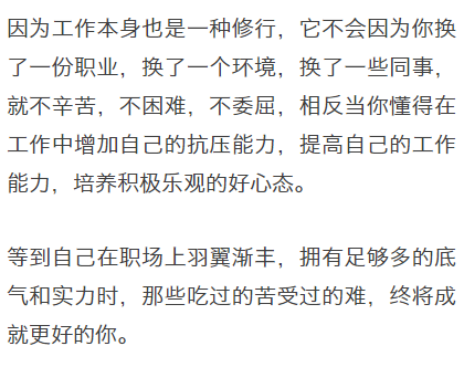 每份工作都有每份工作的苦和累,每份工作都需要承担相应的责任和压力,当你没有能力说走就走,没有能力让自己在跳槽这件事上越走越好时,你要知道,你的工作辛苦,其实是太正常不过的事。
