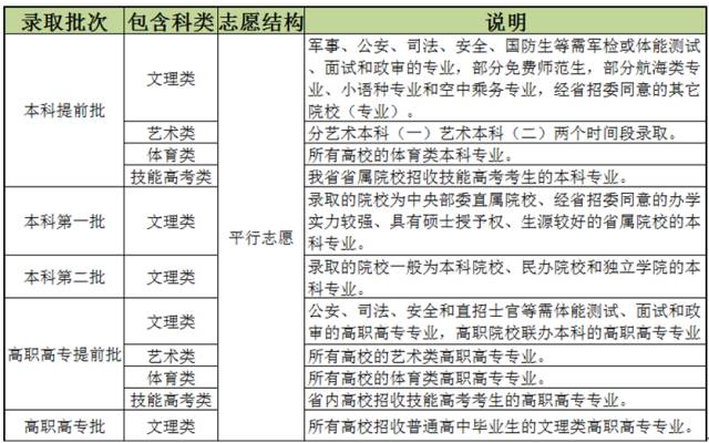 提前批文科、高职高专文理类设6个平行的院校志愿,与去年一致;其他批次的平行志愿均设9个平行的院校志愿,艺术批次和体育批次的平行志愿院校数量由去年的6个增加到9个。