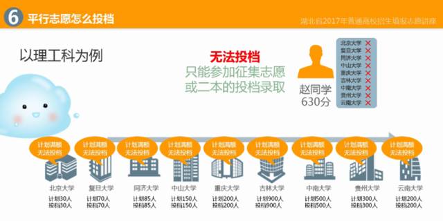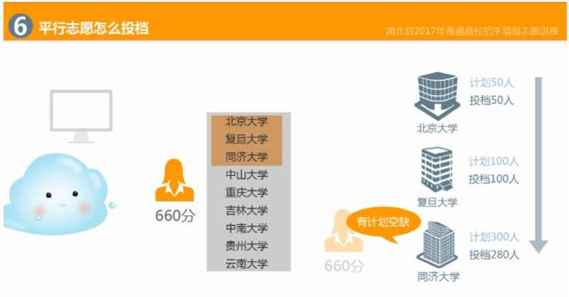 如图所示,该考生高考总分660分,依次填报了北京大学、复旦大学、同济大学、中山大学等9个院校的平行志愿。按照志愿顺序依次检索投档,北京大学、复旦大学的计划数已满,考生档案无法投进,同济大学有计划空缺时,就投到了该院校。