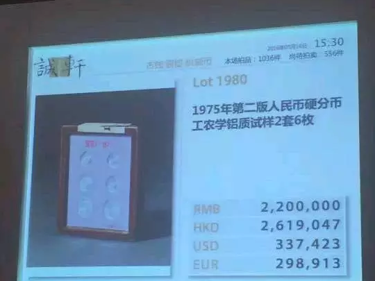在去年的北京这一卖会钱币邮品中国现代铸币部分专场拍卖中,1975年第二版人民币硬分币“工农学”铝质试样2套6枚最后的成交价格为253万元人民币(含佣金价),成为钱币专场的标王。