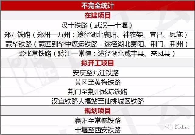 中国铁路总公司已分别完成襄阳至常德铁路设计招标和十堰至西安铁路实地踏勘,总体方案已基本确定,其中襄阳至常德湖北段已确定襄荆宜线路走向,预计今年底前完成可研审批,计划明年开工;