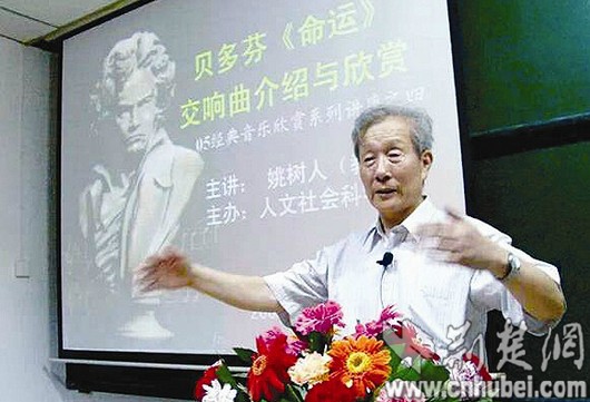 图为:姚树人多才多艺,生前为学生讲授音乐欣赏课 (资料图片)