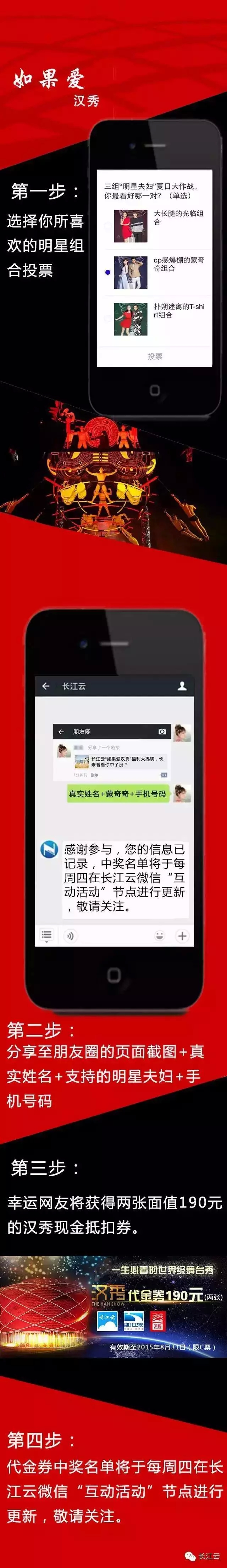 关注“长江云”微信公众号,为你喜欢的“明星夫妇”投票助威并参与我们的活动,就能赢取价值190元“汉秀”现金抵扣券两张哦!先到先得送完即止的哟!