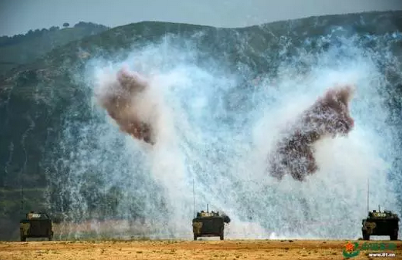 开幕式中,国产ZBD-03空降战车在进行实弹射击(沈玲 via 中国军网)