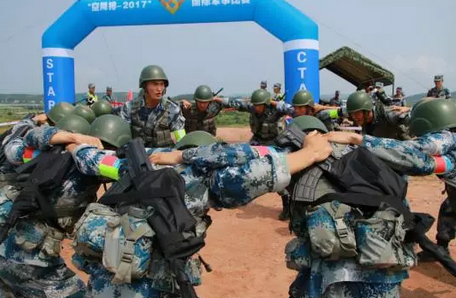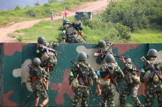 “越障与射击”比赛精彩上演,中国、伊朗、哈萨克斯坦、俄罗斯、南非和委内瑞拉六个国家参赛队围绕“通过障碍”、“进攻射击”、“排协同射击”等内容展开激烈角逐。