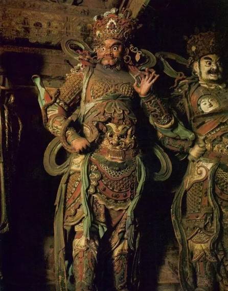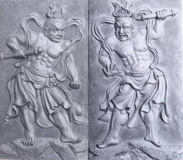 右边的金刚横目张口,左边的金刚怒颜闭唇。据说佛祖常有500名执金刚侍卫。后来受神魔小说《封神演义》的影响,这两尊像被称为“哼哈二将”,闭嘴巴的是“哼”将,张嘴巴的是“哈”将。
