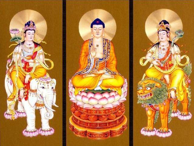 在有的寺庙,“三世佛”两侧各有两位菩萨。药师佛两侧分别是日光菩萨和月光菩萨;阿弥陀佛两侧分别是观世音菩萨和大势至菩萨;释迦牟尼两侧分别是文殊菩萨和普贤菩萨。