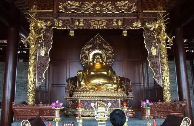 天王殿正中为袒胸露腹的大肚弥勒佛。弥勒佛是未来佛,他是释迦牟尼的接班人,但要等释迦牟尼寂灭后五十六亿七千万年后,才降临人间,正式升为弥勒佛,所以现在其实只是弥勒菩萨。