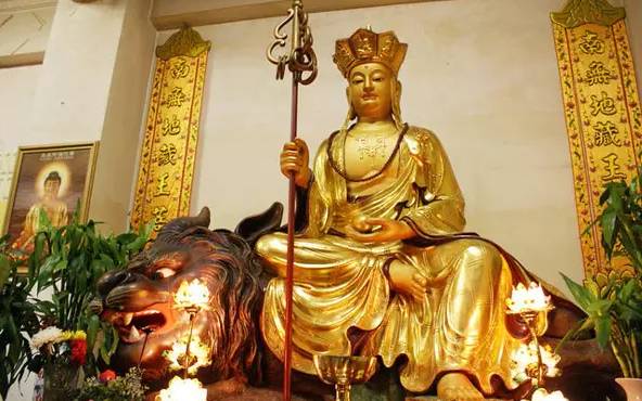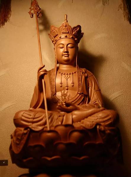 他左手持宝珠右手执锡杖,或坐或立于莲华上。其坐骑为“谛听”,又称“独角兽”。