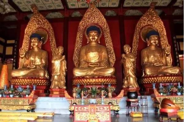 还有的大雄宝殿树的是“三世佛”,代表东、中、西三方不同世界的佛:中间的是现世佛释迦牟尼;左边的是东方琉璃世界之主药师佛;右边的是西方极乐世界之主阿弥陀佛。