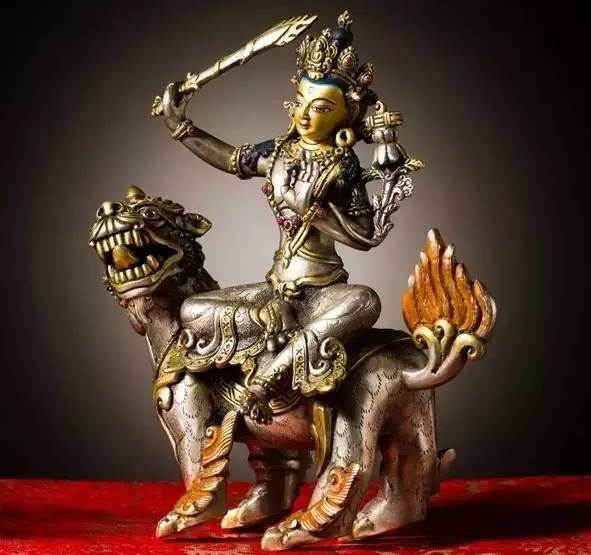文殊菩萨:右手持智慧剑,左手持的莲花上放置般若,经骑乘狮子,比喻以智慧利剑斩断烦恼,以狮吼威风震慑魔怨。