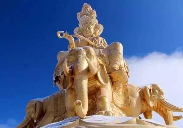 普贤菩萨:头戴五佛金冠,身披袈裟,手执如意,神态庄重,坐骑为白象。