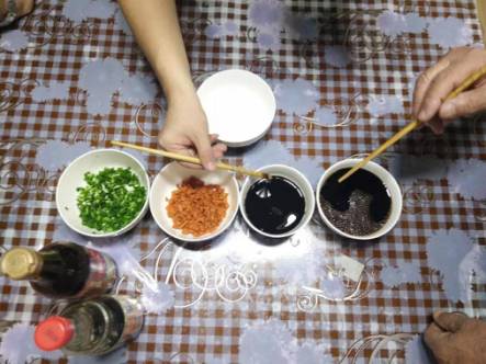 蔡:必须用香醋哦!我看我父亲是用这个,我也说不上来,但就是味道好!如何选香醋呢?就是把瓶子摇一摇,有气泡凝而不散的,就是好香醋,和酒一个道理。