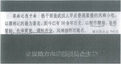 根据90年版《武汉市志·商业志》记载,“热干面是武汉人早点普遍喜爱的风味小吃,以蔡林记的最为著名,距今已有50余年历史。以制作精细、条细桨韧、色泽黄亮、调料齐全、风味独特而驰名”。