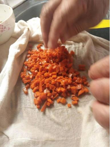 蔡:这第二个就是胡萝卜 切成条,不放水,用酱油、盐、五香粉、尖辣椒腌制四到五天,再用纱布把水挤出来,切丁备用,现在很多热干面用白萝卜代替,加防腐剂和色素,这个就不好吃 。