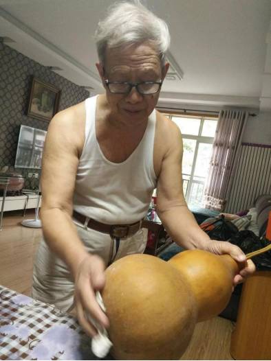 蔡:你看到我这个葫芦没有?这个比我的年纪还大!这上面还有油印子!这个是当年我们家里用来捣小磨香油用的,先把芝麻把成酱,再加百分之八十的开水,再慢慢用葫芦捣,这个芝麻皮和肉就慢慢成渣沉到下面,油比水重,就会慢慢浮在表面,这个是热干面最重要的调料!不能用麻油来调热干面,那个是直接榨出来的,不香!但是现在的小磨香油很难买到好的,原来二斤半芝麻才能出一斤油,算人工,差不多要30块钱一斤,现在的小磨香油基本上都是调合的,要是你你在菜场上看到有人现捣小磨香油,就可以搞一点儿。