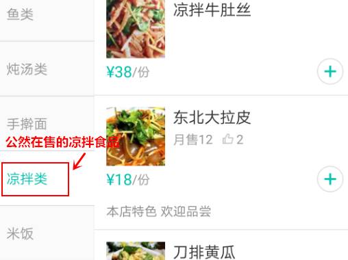 相同问题的还有百度外卖上的一家位于将军路的星云家常菜,从这家店的营业执照上看,它也是不能经营凉菜制品的,可是消费者同样可以在它家的外卖点单界面点到香菜拌牛肉之类的凉菜。