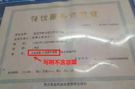 例如:美团外卖上的一家饺子馆,在商家上传的餐饮服务许可证上可以看到,这家店的单位名称是武汉市桥口区江氏饺子馆,备注说明经营范围不含凉菜。但实际上在外卖菜单上,这家江氏饺子馆变成了东北菜饺子馆,并且堂而皇之地将凉拌牛肉、凉拌毛豆等凉菜纳入经营范围。