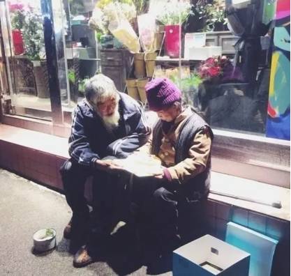 老伴很高兴,小心翼翼把蛋糕抱在怀里。在他们的身旁,还有一个白色乞讨的饭缸。