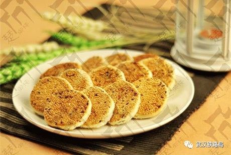 「 黄石港饼是黄石的汉族传统名点之一,由面粉.芝麻.冰糖.小麻油.金钱桔饼.糖桂花等十几种上等原料组成. 以其起锣弦鼓边,麻色黄亮,松酥爽口,甜润清香,顺气开胃,回味悠长和具有浓郁的天然麻香味的独特风味名扬全国。」