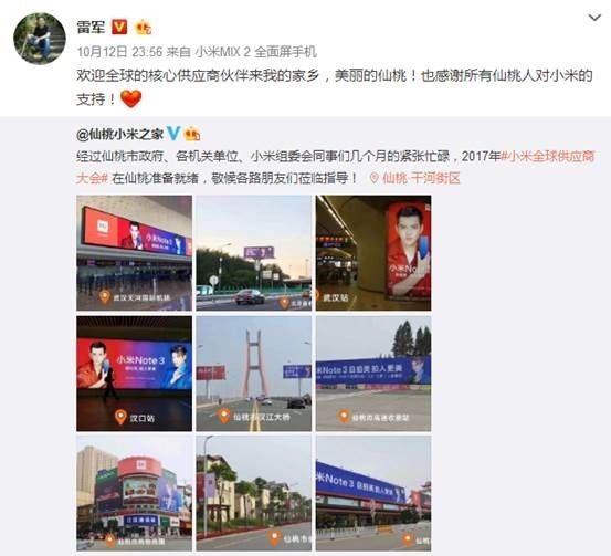 今天的仙桃,绝对是“小米之城”!仙桃临街广告牌几乎全是小米手机,就问你服不服?如此盛会,雷军怎会错过发微博宣传的好机会?于是,拥有1520多万粉丝的大V上线了!