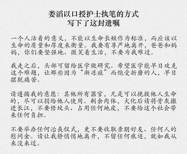 在她清醒之时,将护士喊到床边,以口授护士执笔的方式,写下了遗嘱,要求捐献出自己的器官,将骨灰撒入长江,不给这个社会带来任何负担,“静悄悄地离开”。