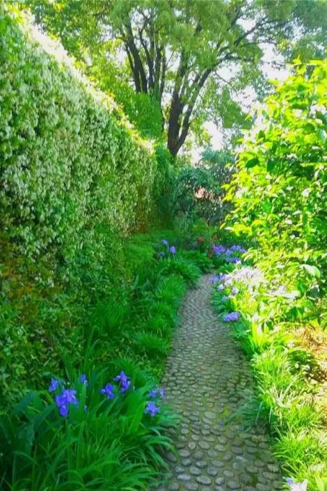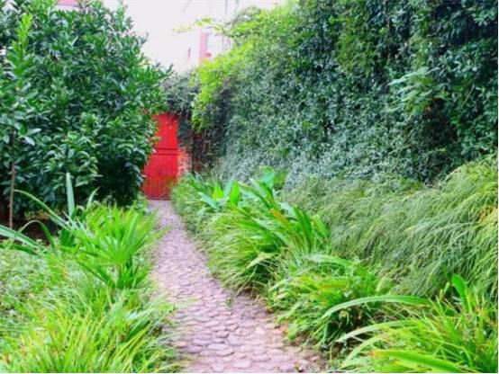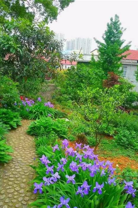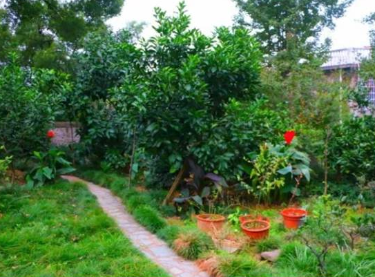 走进庭院,鹅卵石铺就的小径两旁,种植着鸢尾、蔷薇等花草和香橙、石榴等果树,果树上挂满果子,压弯了枝头。一百多平方米的庭院,幽静得犹如一个世外桃源。