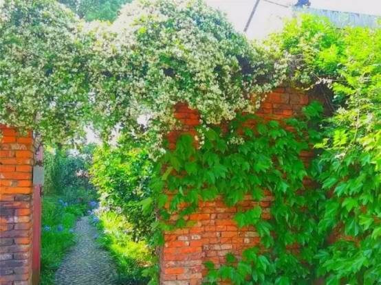 还未走近老夫妻家的庭院,远远地就可以看到别致的院门上方,绿意盎然的络石垂挂而下,配上被绿植爬满的红砖围墙,散发出浓浓的文艺味。