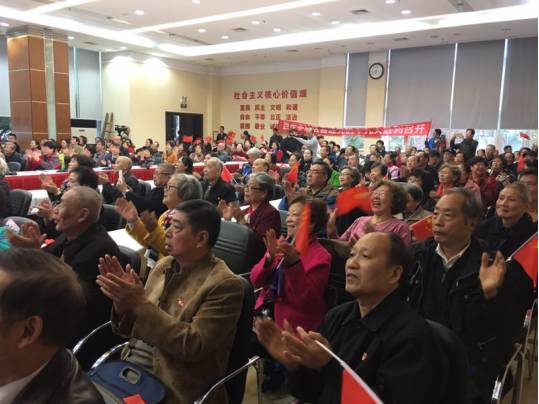 武汉百步亭社区党员群众服务中心,社区400多名党员群众齐聚一堂,集中收看十九大开幕会直播。