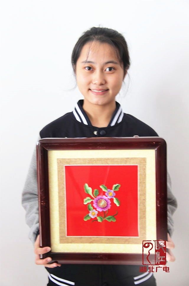 今天她戴的这条汉绣围巾,就出自武汉市第一聋哑学校初三女生陈灏文之手。