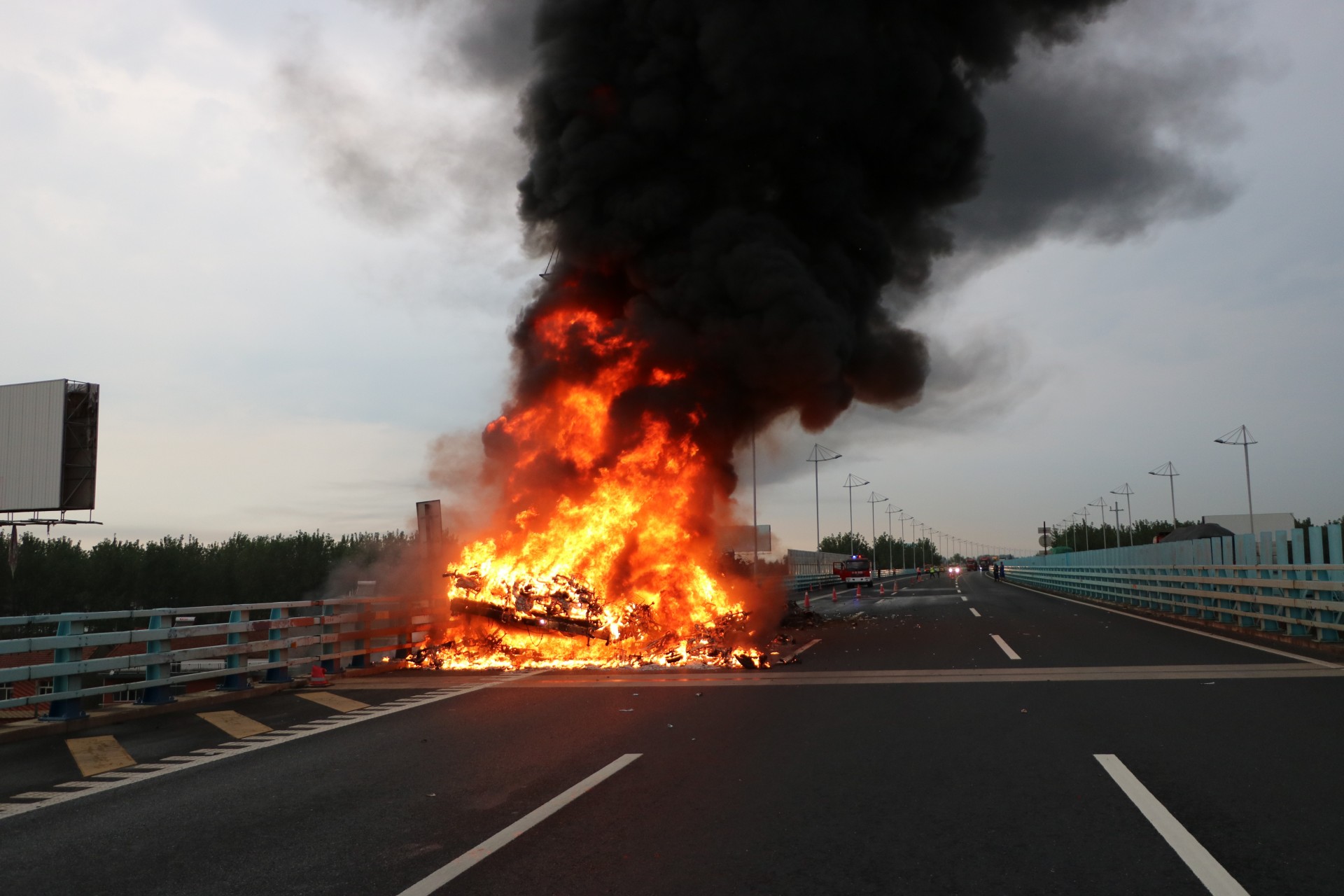 黄冈黄梅:半挂车高速起火 近500辆电瓶车全部烧毁