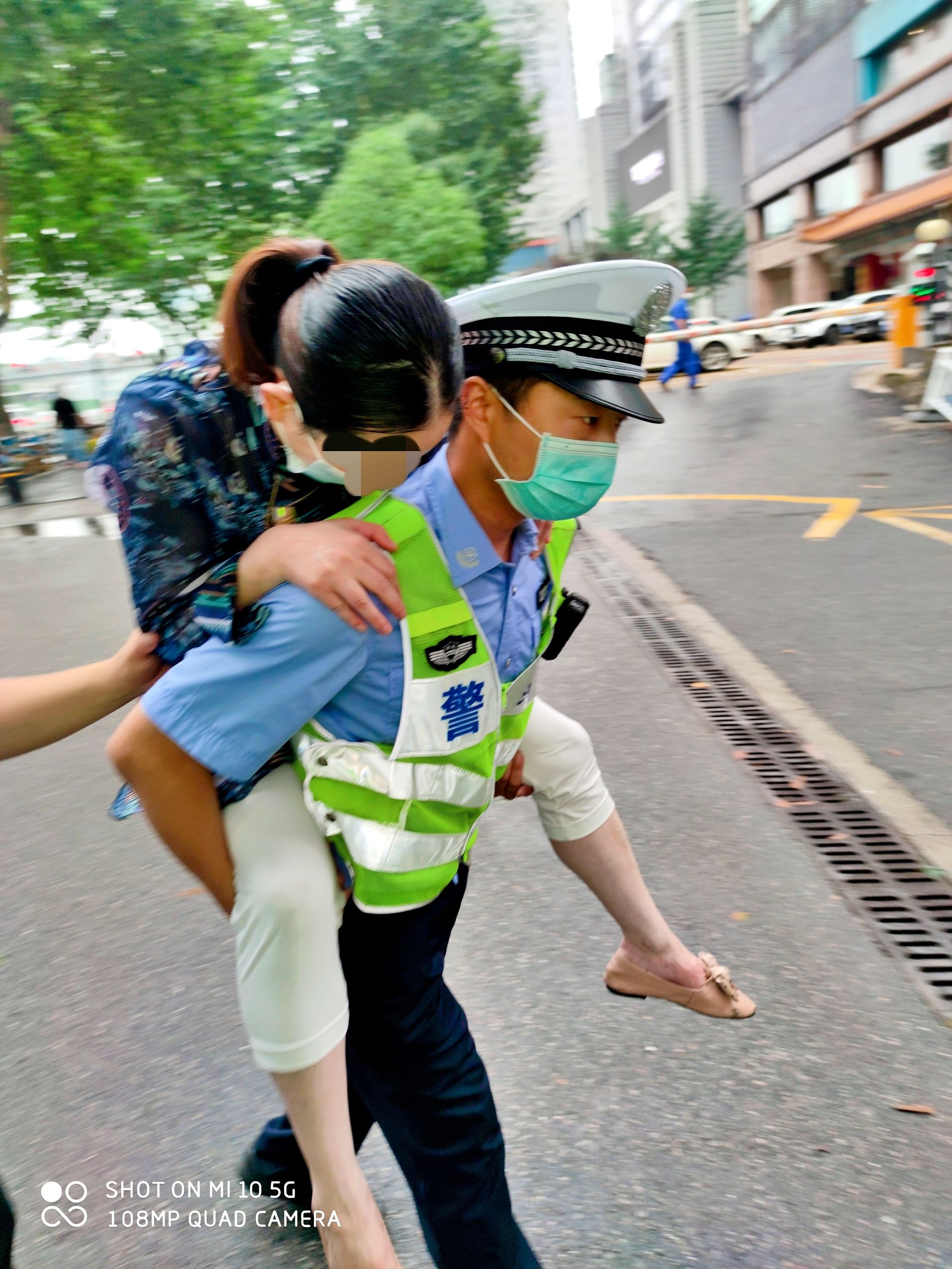 女子骑行不慎摔伤 帅气交警背送上班