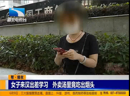 帮 维权:女子来汉出差学习 外卖汤里竟吃出烟头