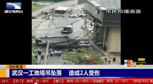 今天上午9点半武汉市武昌区和平大道一处工地塔吊坠落,部分砸在了和平大道上,一辆私家车被砸中,两人受伤,我们来看现场情况。
