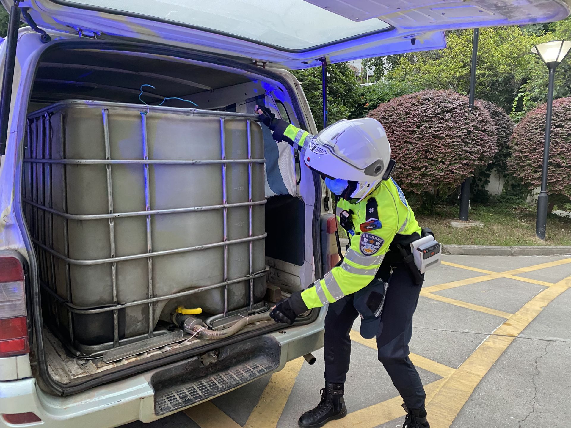民警示意面包车司机靠边接受检查,当打开车门一刹那,一股浓烈的柴油气味扑鼻而来 ,一个巨大的白色塑料罐体横卧在后厢内,一把加油枪、一部计量器、一根加油管同塑料罐体相连,原来柴油味就是从罐体里散发而来