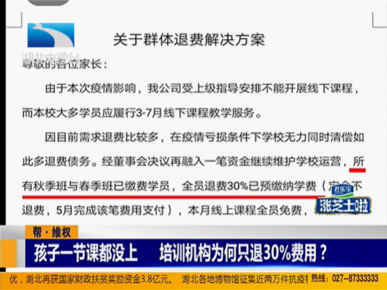 帮·维权:孩子一节课都没上 培训机构为何只退百分之三十费用?