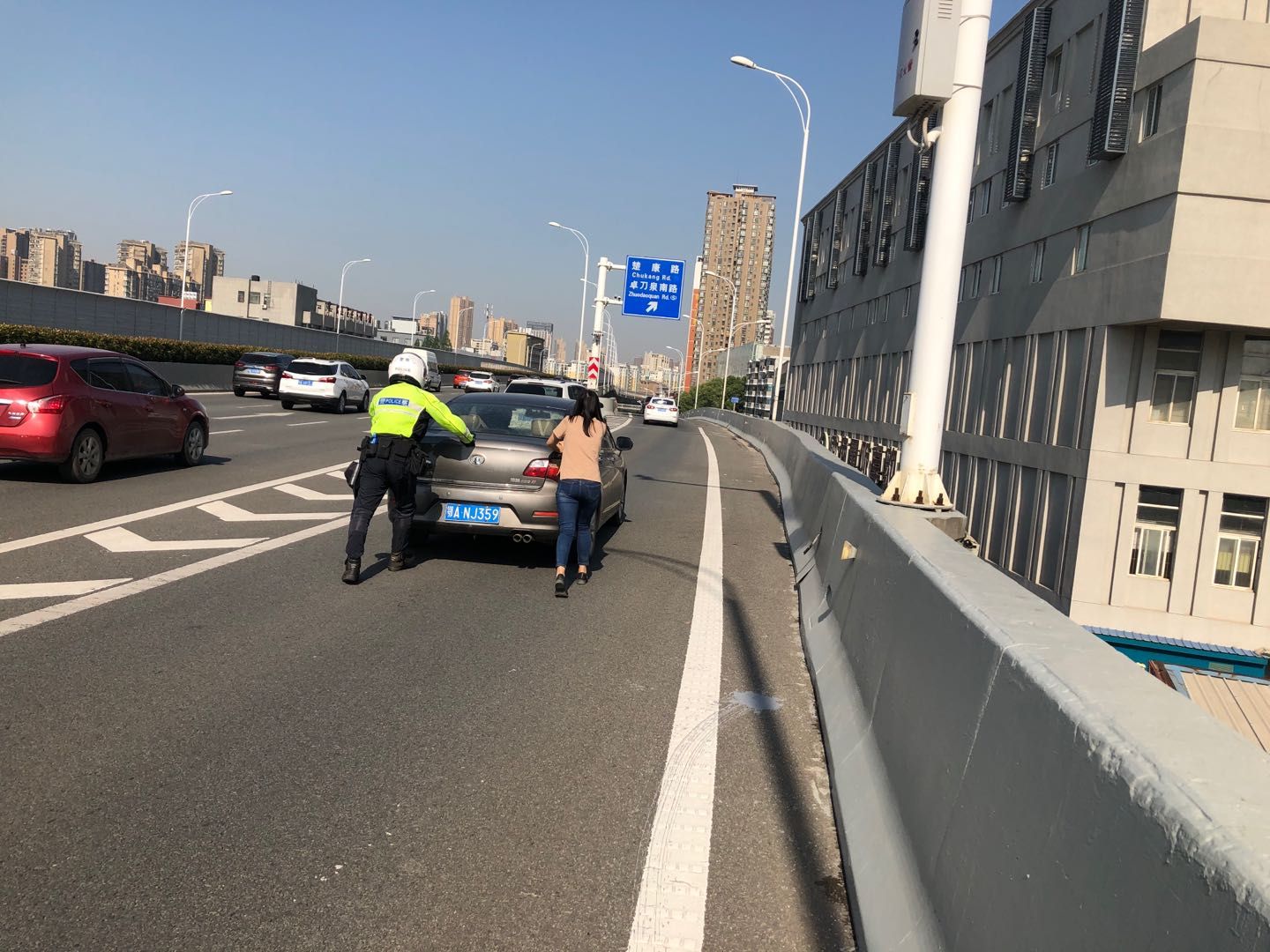 小车突然熄火冒烟,交警紧急推车排险