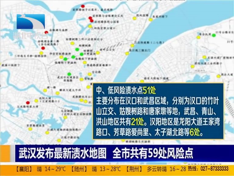 根据最新会商研判,今年我国气象水文年景总体偏差,极端事件偏多,涝重于旱。位于长江中游多雨区的武汉,今年发生区域性洪涝灾害的可能性极大。今天(5月9日)上午, 武汉市水务局发布了最新修编后的渍水风险图, 武汉市中心城区(含东西湖区)的 59 处易渍水风险点 。