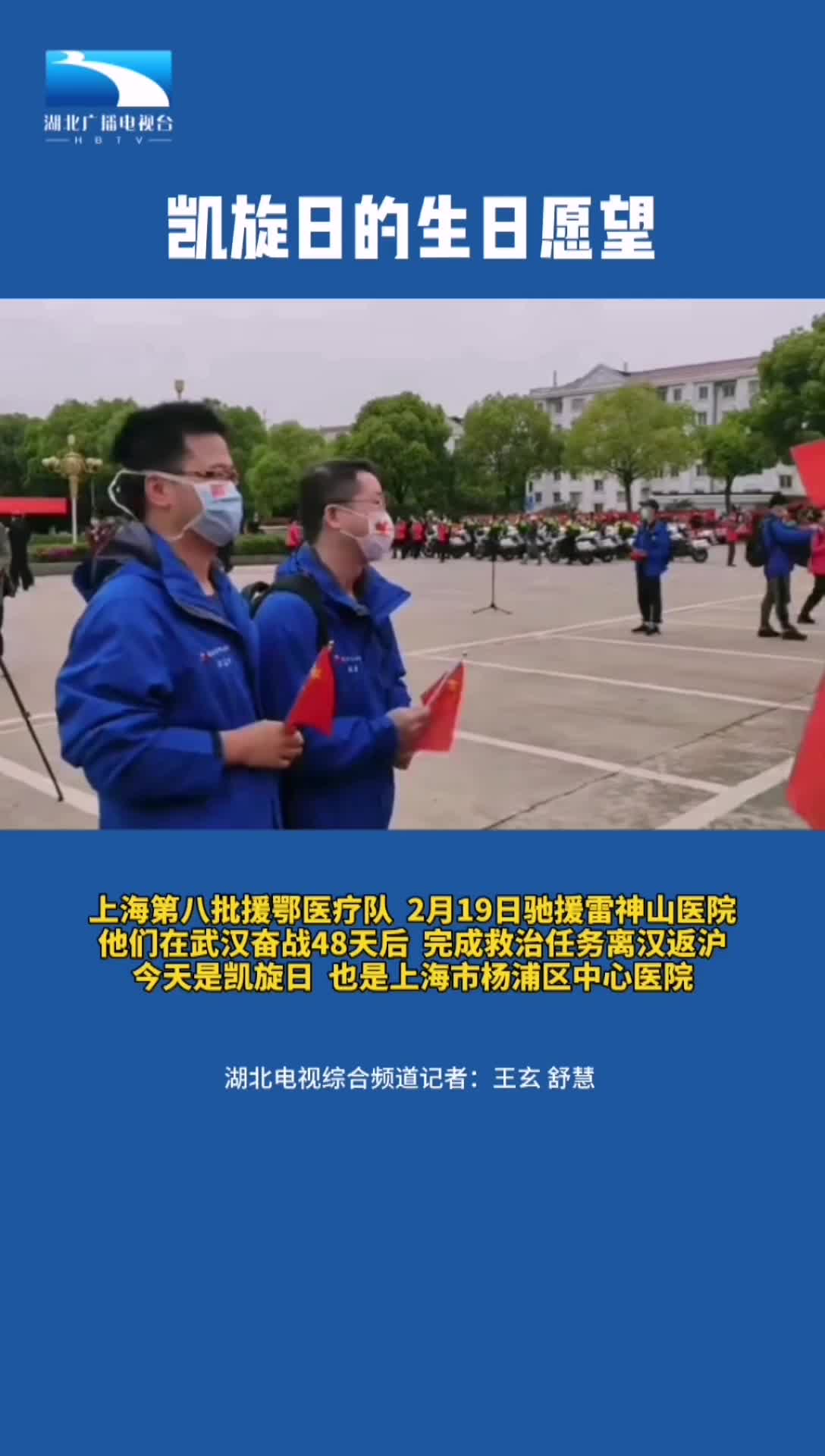 上海第八批援鄂医疗队,2月19日驰援雷神山医院,他们在武汉奋战48天后,完成救治任务离汉返回沪,今天是凯旋日,也是上海市杨浦区中心医院,戴晓勇 (46岁),汪志方(38岁)医生的生日,队员们齐唱生日歌。(湖北电视综合频道制作)