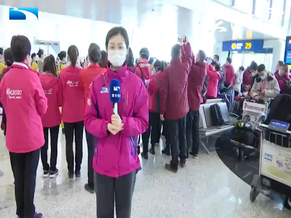 现在是下午三点半,我现在是在武汉天河机场。从3月17号开始,这里就有全国各地的援鄂医疗队陆续从这里启程返回自己的家乡。在我身后的这支医疗队,是今天将要离开武汉的上海援鄂医疗队。(湖北电视综合频道 制作)