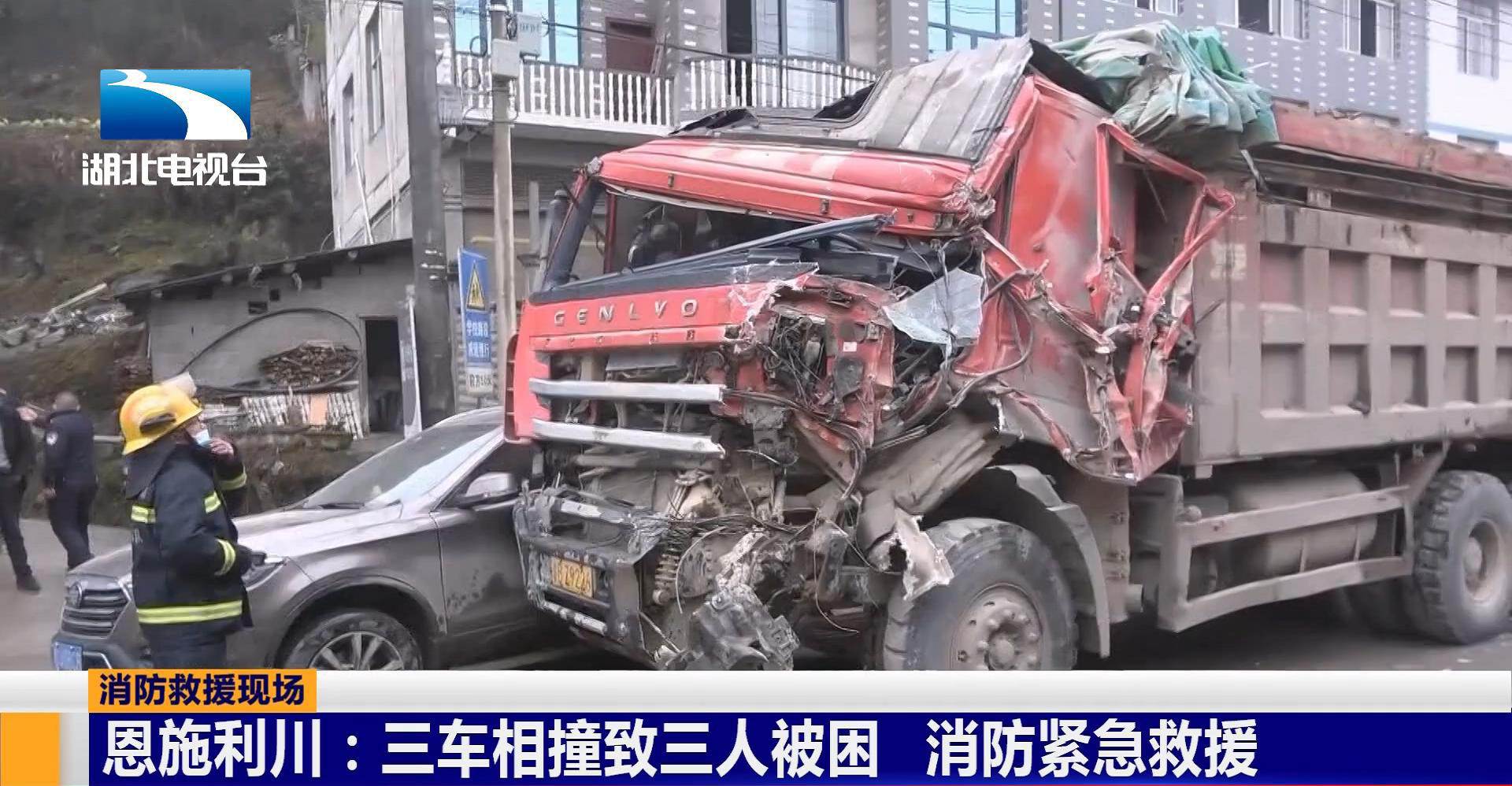 1月21号中午11点20,恩施州利川市发生三车相撞事故,三名驾驶员被困。接警后,当地消防救援、公安、医疗等部门紧急展开救援。