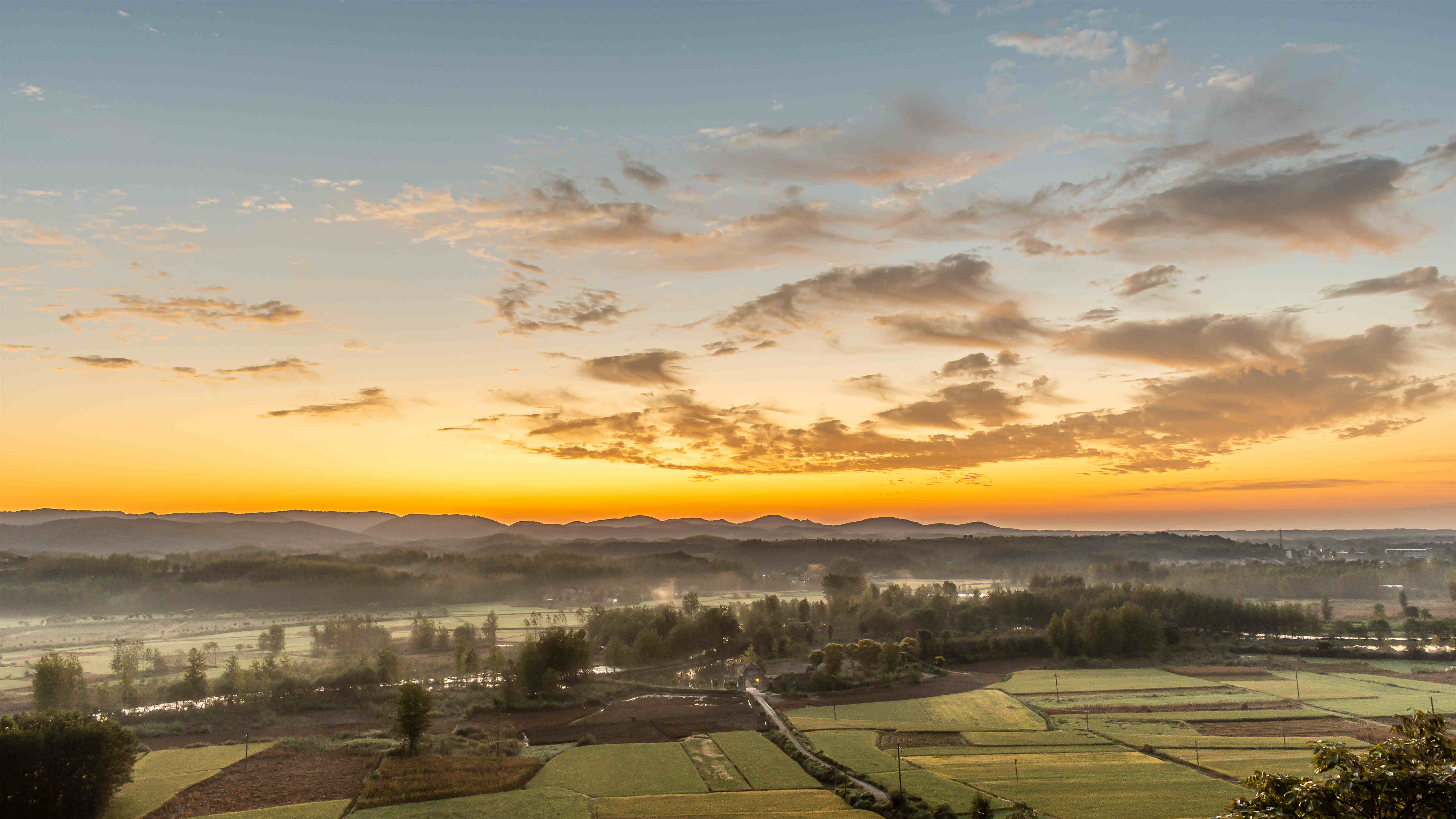 秋天的南漳总能给人很多意外的惊喜。当初升的太阳从云中升起,洒下缕缕金光,缤纷的色彩映红了整片天空,从高空俯瞰,成片由青绿变得金黄的稻田,在秋风中涌起波浪,呈现出一幅绝美的画卷。(摄影:李宗俊)