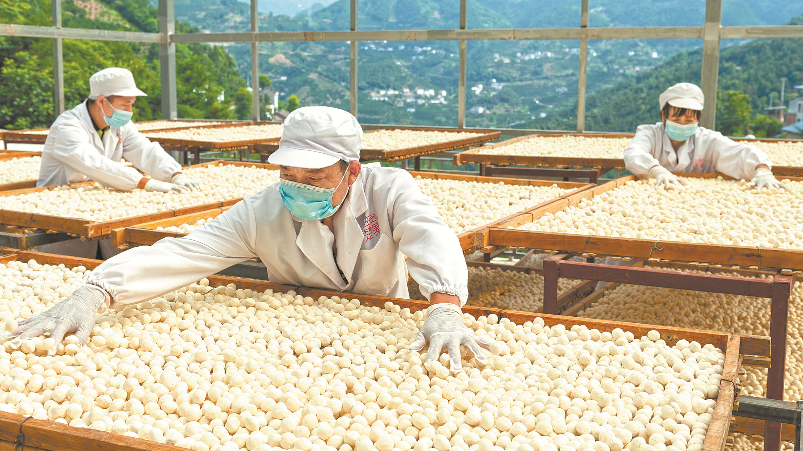 近日,湖北省秭归县归州镇向家湾村湖北楚寨发酵制品有限公司生产车间里,电气化生产设备运转如飞,一颗颗洁白溜圆的小酒曲不断地从流水线上涌出。(摄影:雷勇)